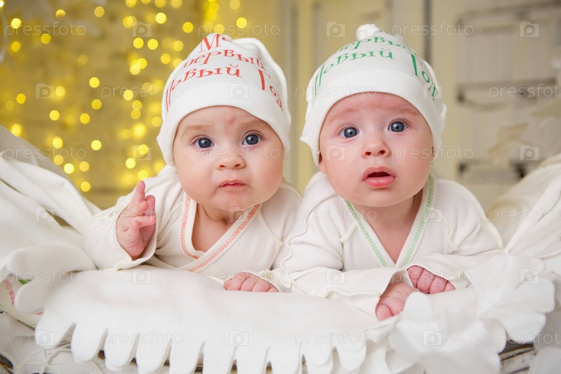 Два маленьких новорожденных мальчика и девочка лежат в белой одежде на ярком фоне. Надпись на шапке на русском языке Мой первый новый год