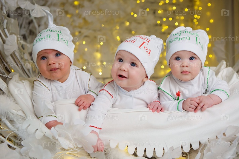 Три маленьких новорожденных мальчика и две девочки лежат в белых одеждах на ярком фоне. Надпись на шапке на русском языке Мой первый новый год