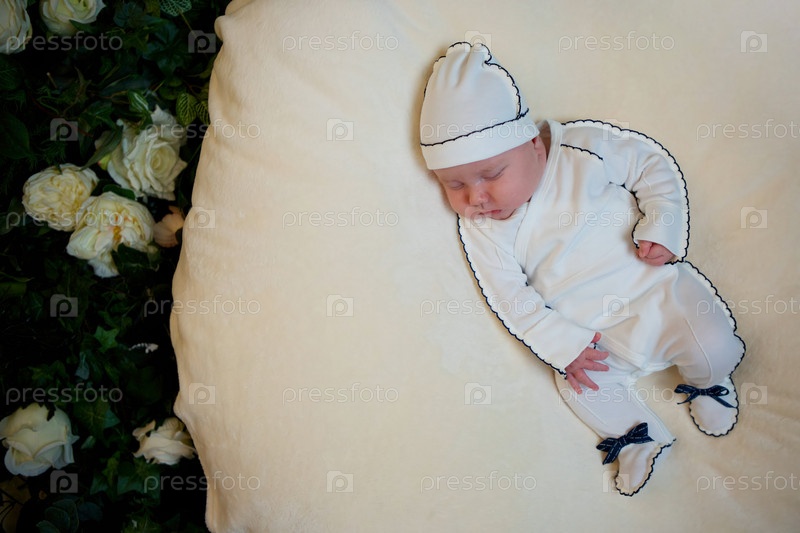 Маленький новорожденный мальчик лежит в белой одежде