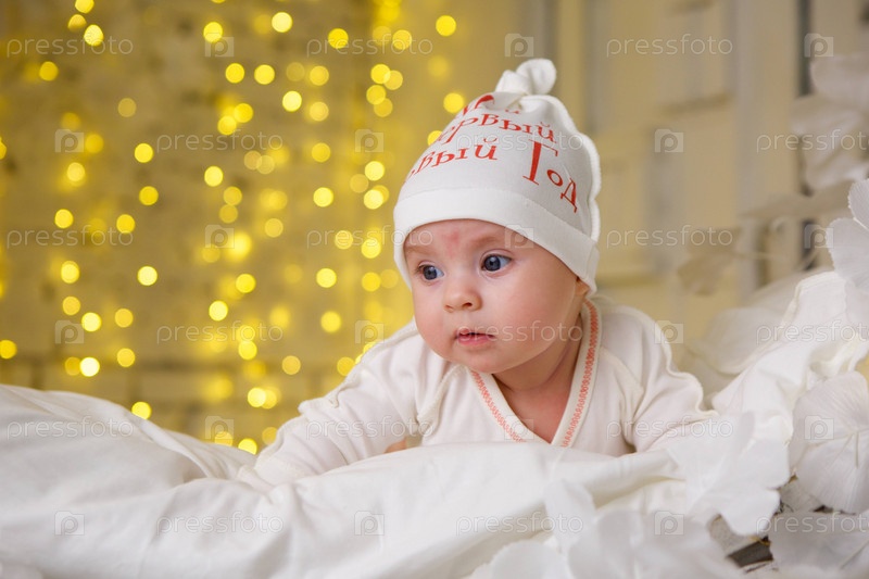 Маленькая новорожденная девочка лежит в белой одежде. Надпись на шапке на русском языке Мой первый новый год