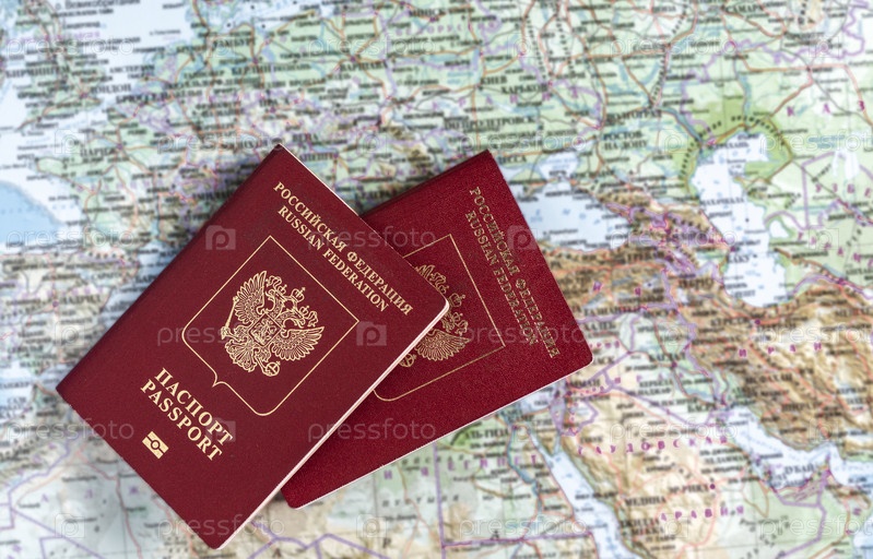 Два российских паспорта на фоне географической карты