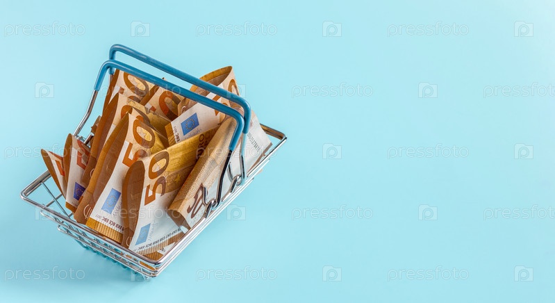 Металлическая корзина из супермаркета, наполненная банкнотами в пятьдесят евро. Копировать пространство