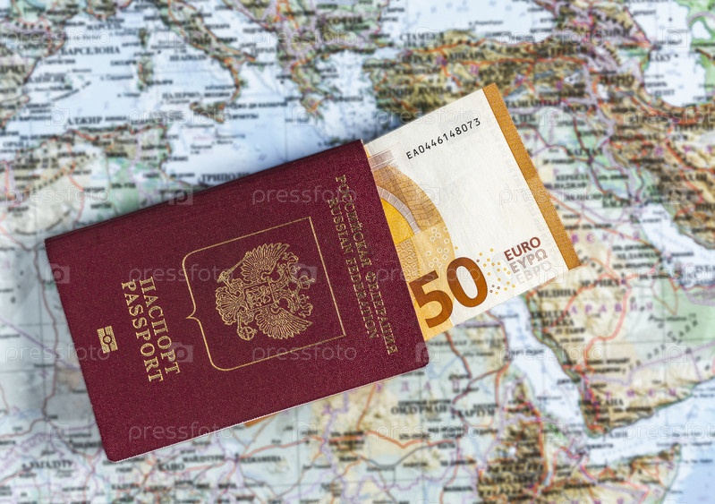 Российский паспорт с банкнотой в пятьдесят евро на фоне географической карты