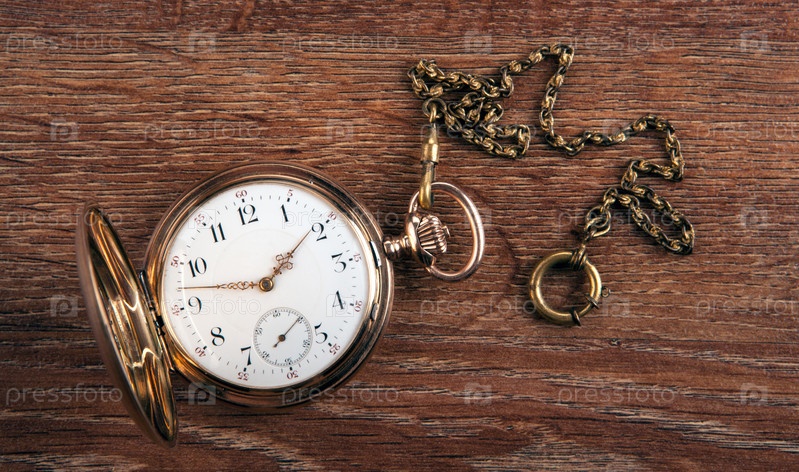 Старинные золотые карманные часы лежат на деревянном столе