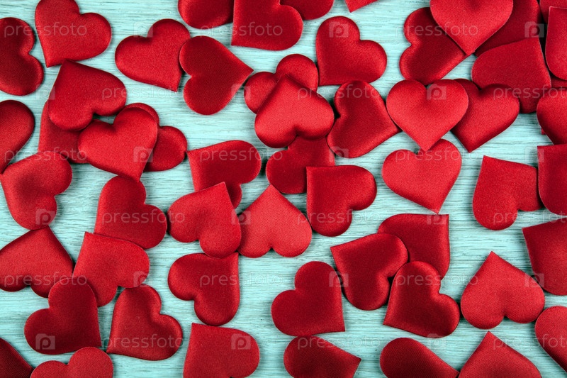 Много сшитых из ткани фигурок в виде фона сердечек