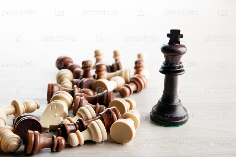 Разбросанные шахматные фигуры и шахматная фигура черного короля на сером фоне
