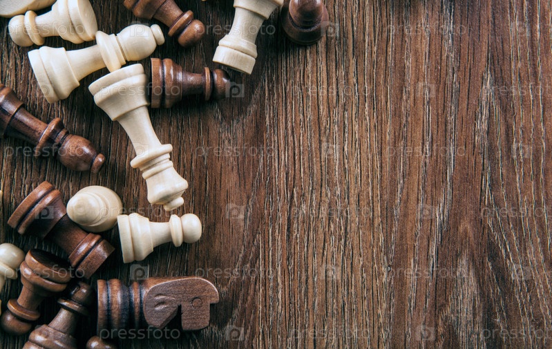 Разбросанные шахматные фигуры на деревянном фоне