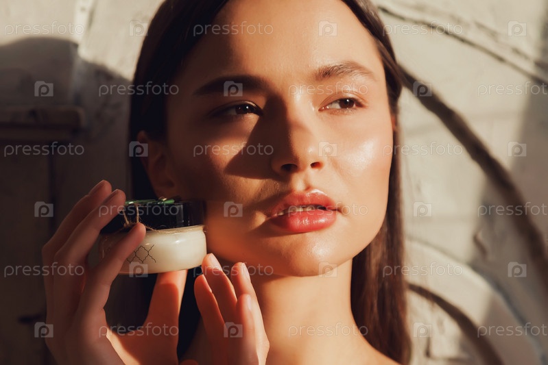 Женщина держит косметический крем для нанесения на кожу лица. Самка держит крем на фоне старой стены с оттенком листвы. Рекламная концепция здорового образа жизни и ухода за собой. Скопируйте место для СПА