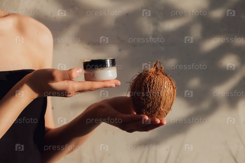 Руки женщины держат косметический крем и кокос для нанесения на кожу лица. Женщина держит лосьон на фоне стены с оттенком листвы. Рекламная концепция здорового образа жизни, СПА и ухода за собой