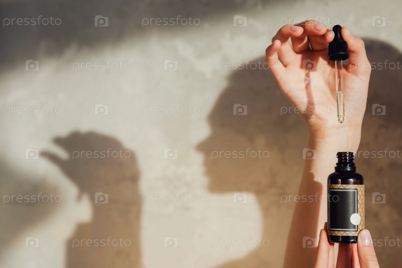 Руки женщины держат бутылки с массажным или косметическим маслом. Закройте эфирное масло на стуле. Высокий угол обзора бутылки массажного масла на старом фоне. Концепция здорового образа жизни и ухода за собой. Копировать пространство