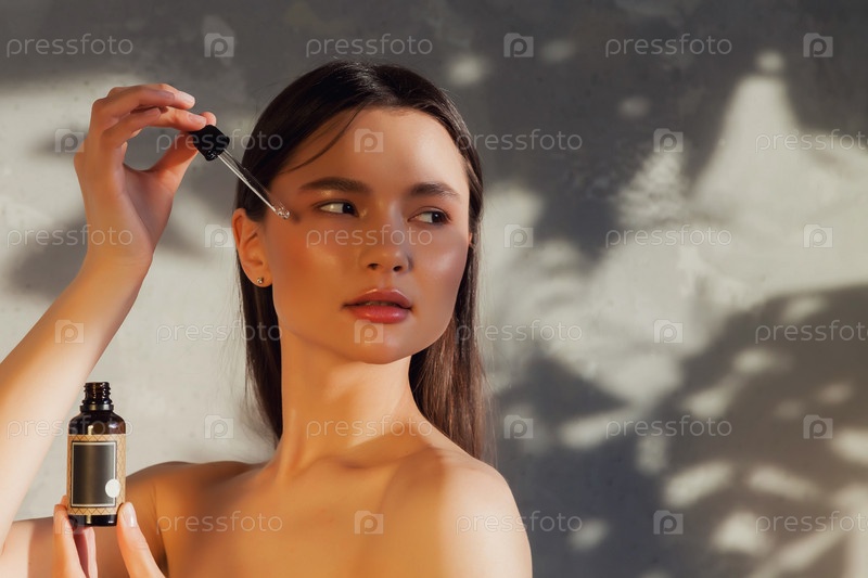 Портрет молодой женщины со свежей идеальной кожей, позирующей на фоне старой стены с тенью от листвы