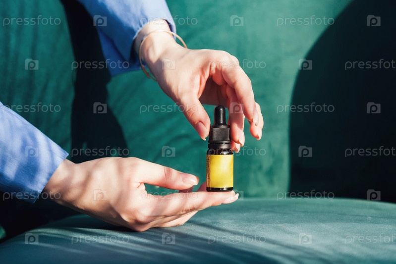 Руки женщины держат бутылки с массажным или косметическим маслом