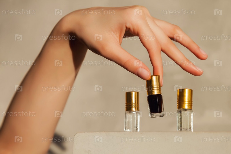 Руки женщины держат флаконы духов косметики на фоне старой стены с тенью от листвы