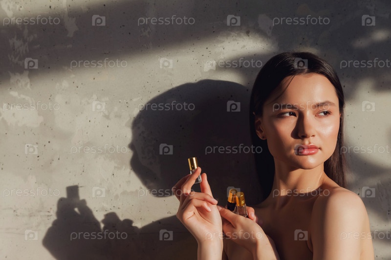 Женщина держит и показывает косметические флаконы духов на фоне старой стены с тенью от листвы. Концепция косметологического лечения. Рекламные концепции здорового образа жизни, СПА и ухода за собой. Копировать пространство