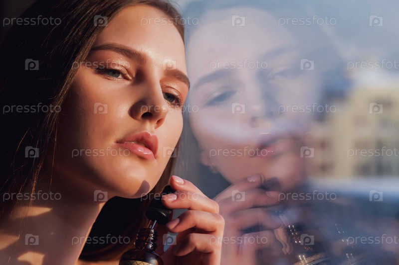 Портрет молодой женщины со свежей идеальной кожей, позирующей у окна с отражением в стекле. Концепция косметологии и лечения. Рекламные концепции здорового образа жизни, СПА и ухода за собой. Копировать пространство
