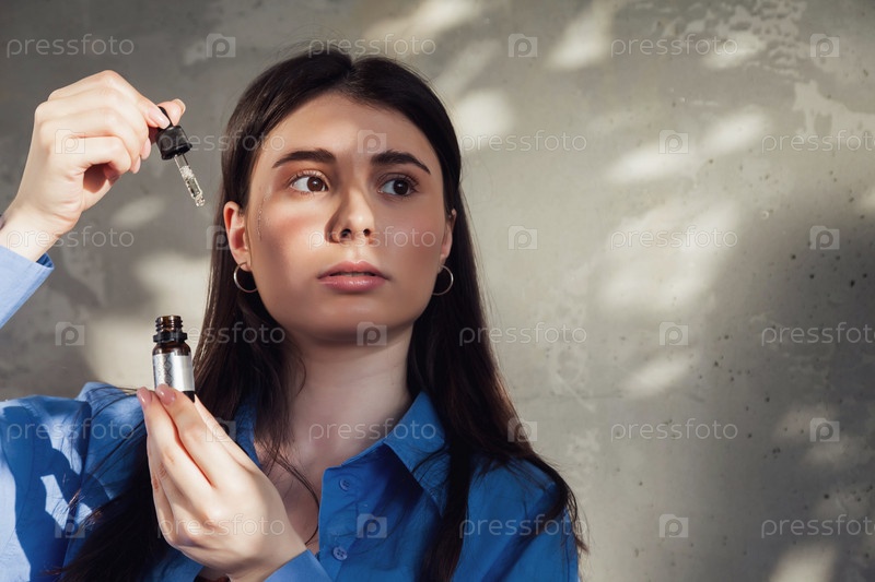 Руки женщины держат бутылку с массажным или косметическим маслом для нанесения капель на кожу лица. Женщины держат масло на фоне старой стены с оттенком листвы. Концепция здорового образа жизни и ухода за собой