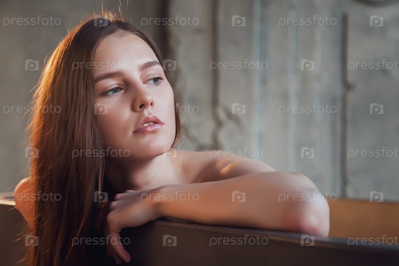 Молодая милая жизнерадостная женщина в ванной в винтажной ванной комнате смотрит в сторону. принимает процедуры, расслабляется и улыбается. Рекламная концепция здорового образа жизни и самообслуживания. Копируйте место для сайта или SPA