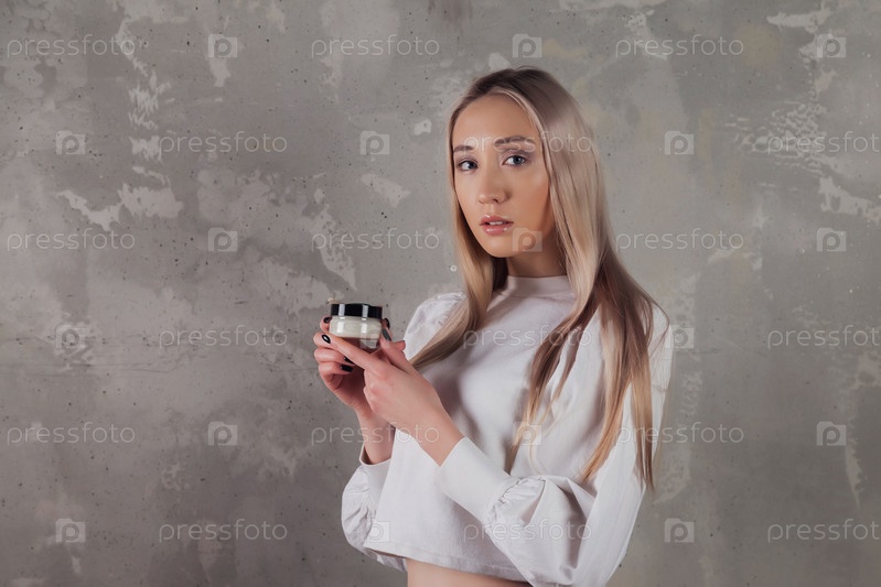 Женщина держит косметический крем для нанесения на кожу лица. держит крем на фоне старой стены с оттенком листвы. Рекламная концепция здорового образа жизни и ухода за собой. Скопируйте место для СПА