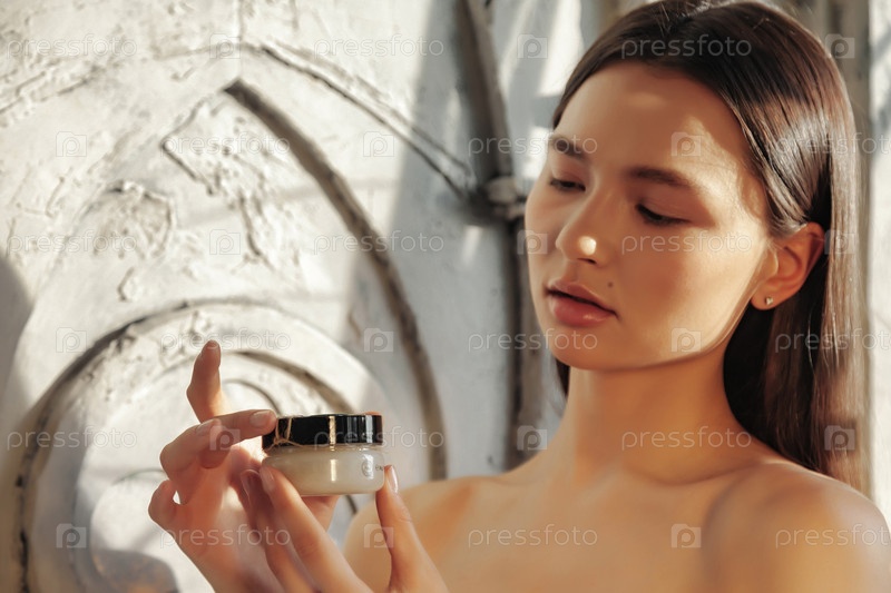 Женщина с косметическим кремом для нанесения на кожу лица