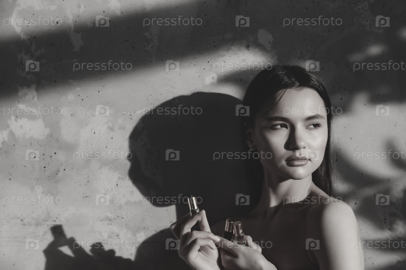 Женщина держит и показывает косметические флаконы духов на фоне старой стены