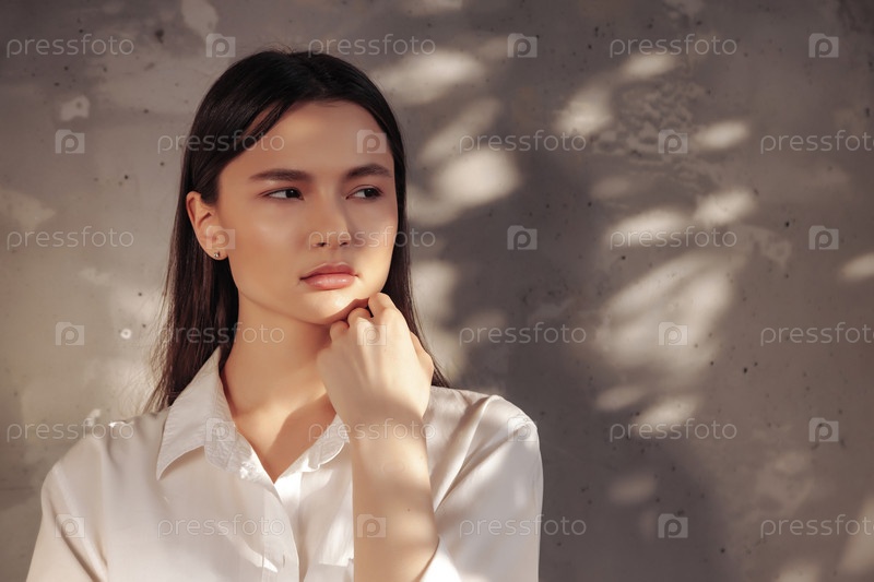Портрет молодой милой жизнерадостной женщины в белой рубашке
