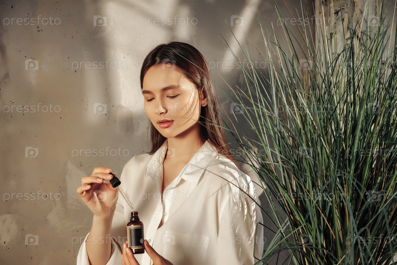Руки женщины держат бутылку с массажным или косметическим маслом для нанесения капель на кожу лица