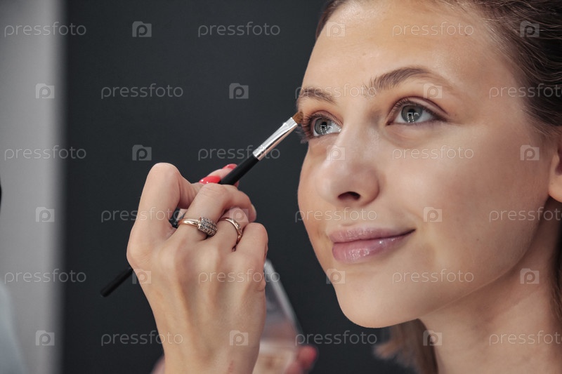 Женский визажист делает милую молодую женщину в салоне красоты