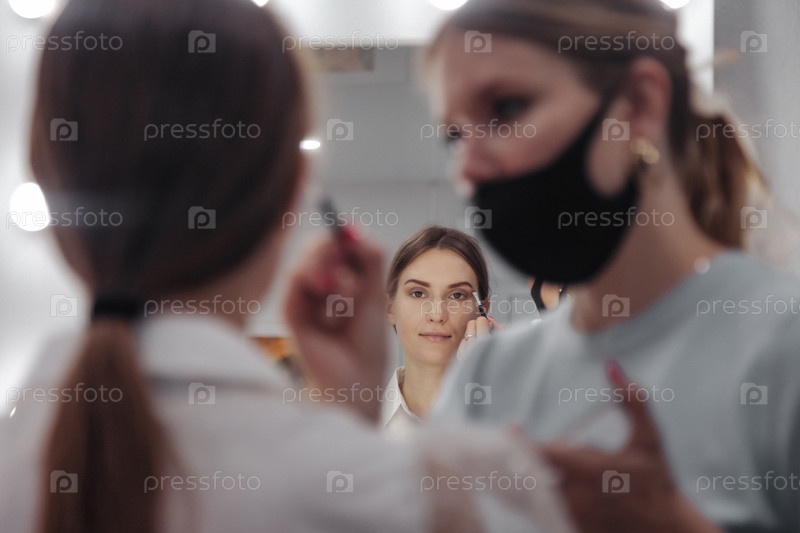Женский визажист красит милую молодую женщину в салоне красоты