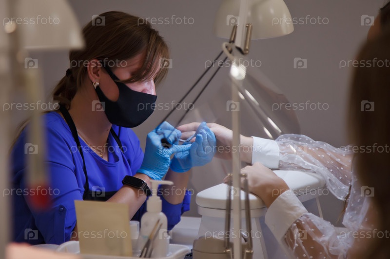 Мастер маникюра делает ногти милой красивой молодой женщине в салоне красоты. Обслуживание клиентов в интерьерном салоне для создания потрясающего образа. Работа мастера по созданию маникюра. Концепция удовлетворения красотой