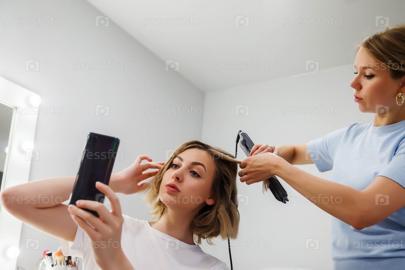 Парикмахер делает прическу милой красивой молодой женщине в салоне красоты. Обслуживание клиентов в интерьере салона создает удивительный образ. Мастер создания рабочих причесок