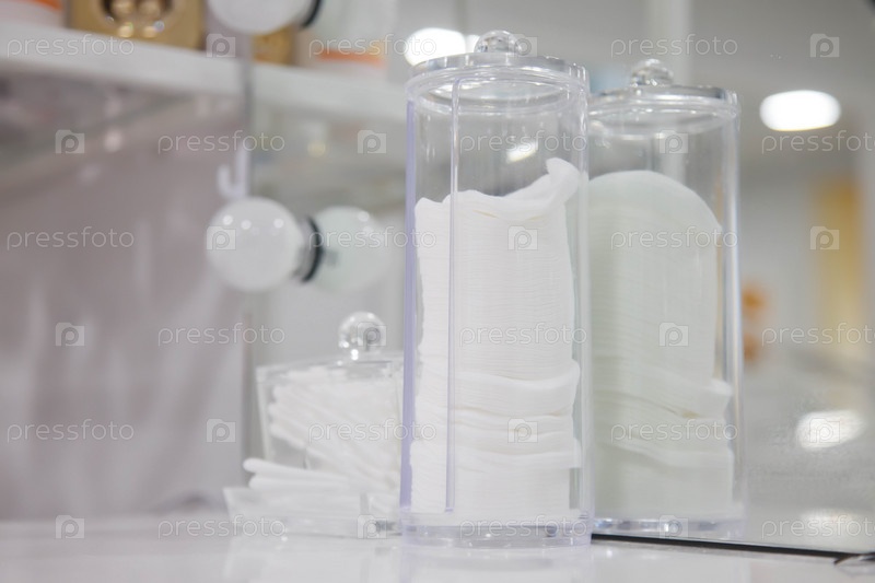 Круглые белые ватные диски и ватные палочки в специальных контейнерах для хранения и использования. Средства гигиены, косметика для ухода за кожей в интерьере салона красоты