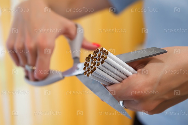 Руки молодой женщины режут сигареты ножницами. Бросьте курить, боритесь с никотиновой зависимостью. Крупным планом ножницы резки много сигарет. Концепция борьбы с курением