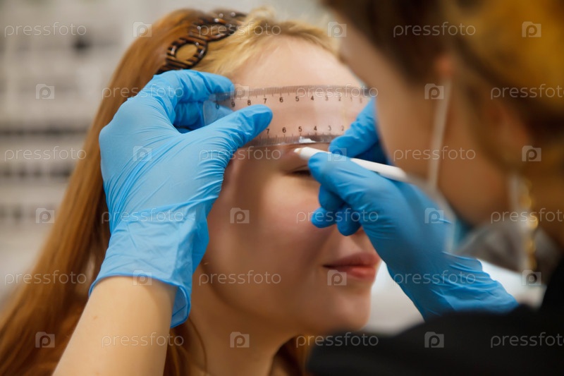 Визажист делает коррекцию бровей милой красивой молодой женщине в салоне красоты. Обслуживание клиентов в интерьерном салоне для создания потрясающего образа. Работа мастера по созданию макияжа. Концепция удовлетворения красотой