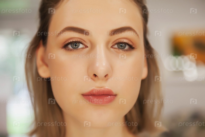 Симпатичная молодая женщина с идеальным макияжем. Крупный план лица красивой модели с естественным макияжем. Спа и салон красоты, уход за кожей и здоровый цвет лица