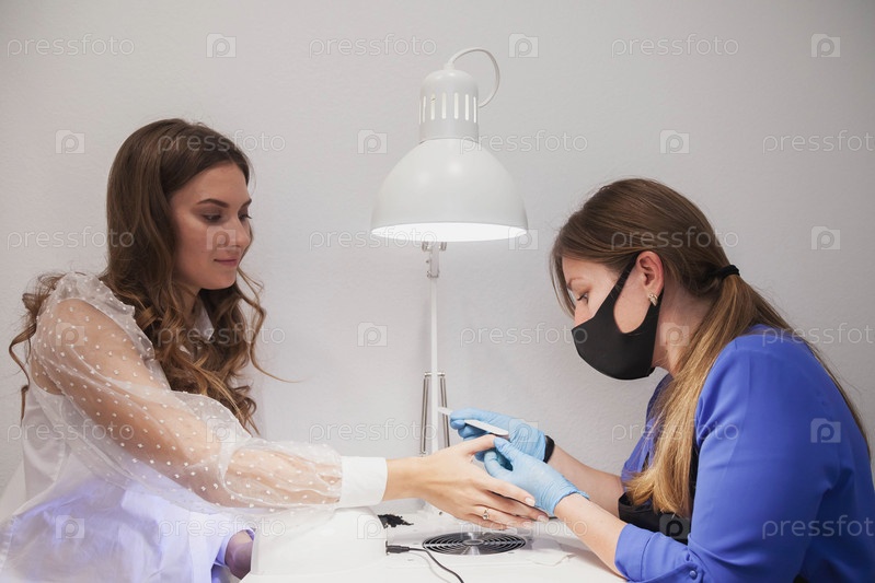 Мастер маникюра делает ногти милой красивой молодой женщине в салоне красоты. Обслуживание клиентов в интерьерном салоне для создания потрясающего образа. Мастер создания работы