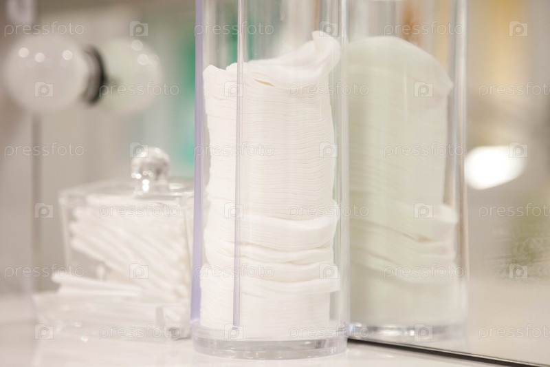 Круглые белые ватные диски и ватные палочки в специальных контейнерах для хранения и использования. Средства гигиены, косметика для ухода за кожей в интерьере салона красоты. Концепция здорового образа жизни
