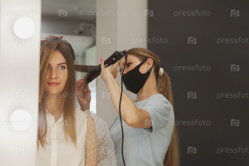 Парикмахер делает прическу милой красивой молодой женщине в салоне красоты. Обслуживание клиентов в интерьере комнаты создает удивительный образ