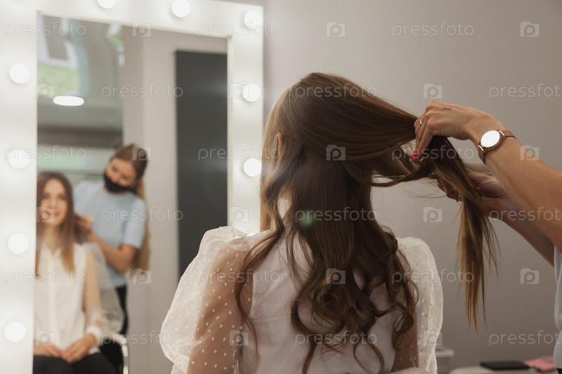 Парикмахер делает прическу милой красивой молодой женщине в салоне красоты. Обслуживание клиентов в интерьере комнаты создает удивительный образ