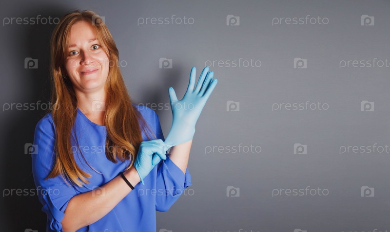 Рекламная концепция косметической и медицинской защиты. женщина в синем лабораторном халате надевает на руки защитные стерильные перчатки на сером фоне, защищая от бактерий и химикатов