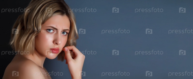 Рекламная концепция недовольства и серьезности. Крупным планом красивый портрет злой недовольной женщины с рукой у головы на темном фоне