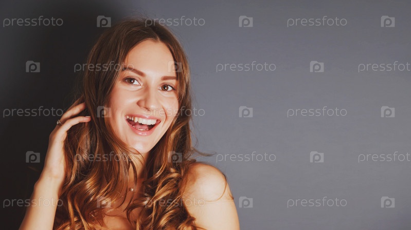 Рекламная концепция косметического и эмоционального флирта. Возбужденная счастливая женщина с длинными волосами на темном фоне