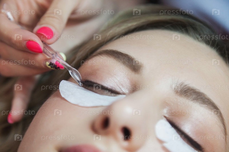 Процесс наращивания ресниц милой молодой женщине в салоне красоты. Обслуживание клиентов в интерьере комнаты создает удивительный образ
