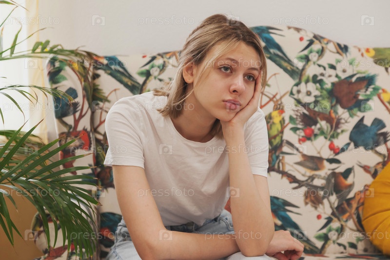 Грустная эмоциональная молодая женщина сидит в зале ожидания и ждет своей очереди. Женщина, сидящая на диване, чувствует себя апатично неудобно. Концепция длительного ожидания в учреждении и больнице. Выборочный фокус