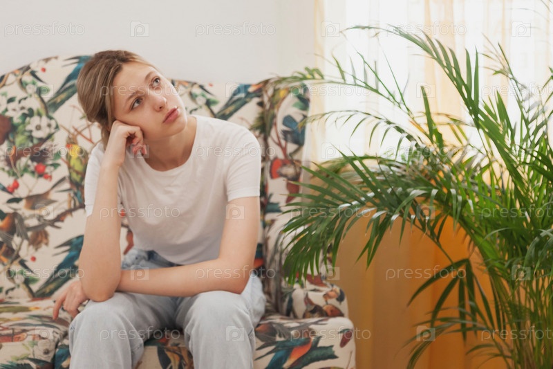 Грустная эмоциональная молодая женщина сидит в зале ожидания и ждет своей очереди. Женщина, сидящая на диване, чувствует себя апатично неудобно. Концепция длительного ожидания в учреждении и больнице. Выборочный фокус