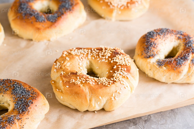 Запеченные рогалики с маком и кунжутом на пергаменте. Домашняя выпечка. Крупный план