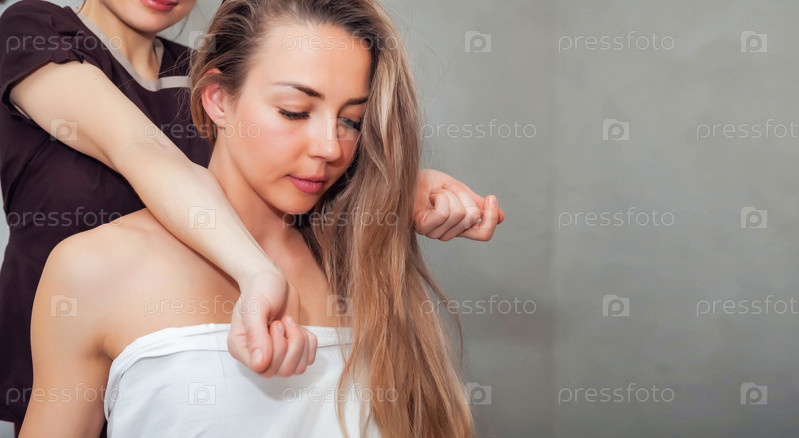 Молодая красивая женщина делает тайский массаж шеи крупным планом в спа-салоне