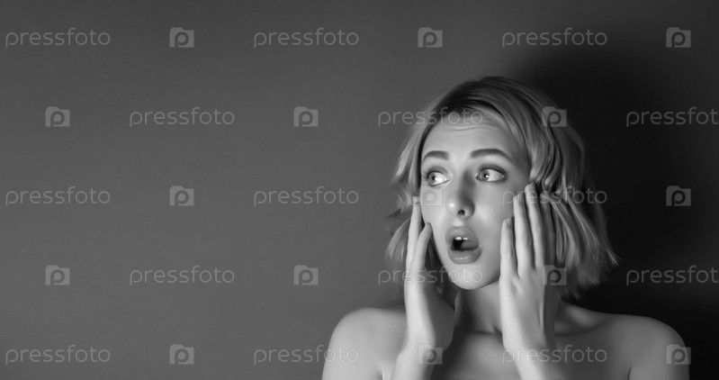 Рекламная концепция удивления и страха. Портрет крупным планом симпатичной молодой женщины, испуганной руками к лицу на темном изолированном фоне. Эмоциональный шрам актрисы. ч/б