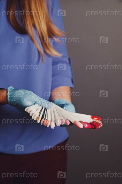 Рекламная концепция маникюра и ухода за ногтями. Женщина-мастер в салоне красоты проводит цветовой тест лаков для ногтей разных цветов и выбирает для покраски. Образцы педикюра