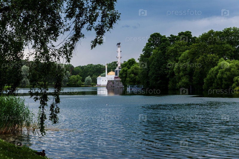 Пушкин, Царское Село, Россия - 22.06.2019. Вид на Чесменскую колонну и турецкую баню