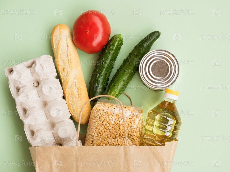 Еда в бумажном пакете: яйца, огурец, масло, помидоры и багет на зеленом фоне